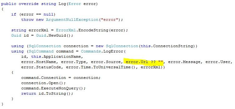 I wanted to be able to group errors by date, type and url and to show the information using charts. It turn out that ELMAH natively supports the first two but the url is embedded in the error XML which is stored in a text field. Looking through the text fields for that url seemed like a stupid thing to do so I downloaded the code and extended it to store the url in a varchar field. First we start with the changes to the SQL. Open the SQL file called SQLServer.sql distributed with the code and make the following additions
