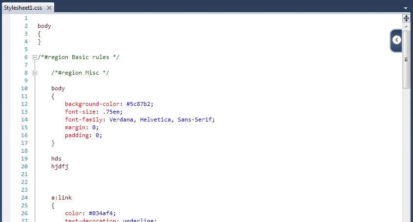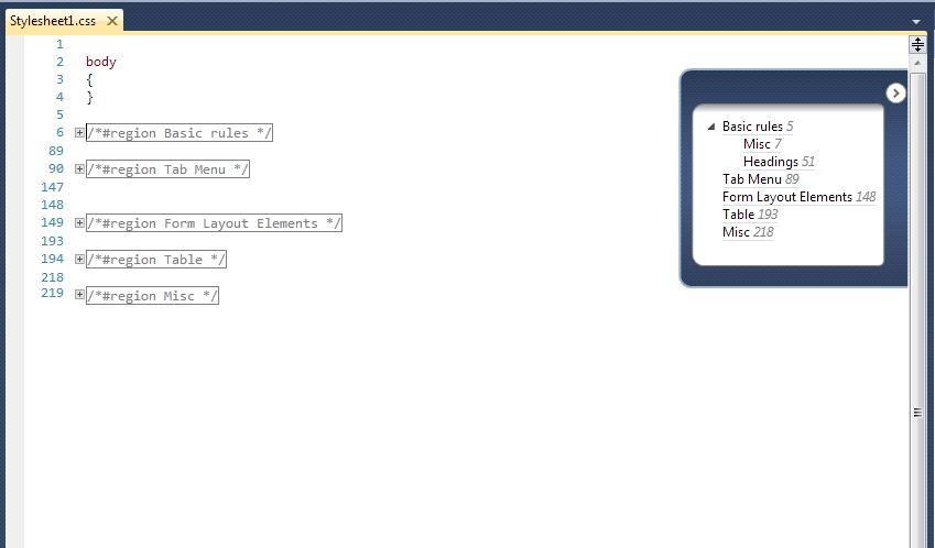 This it how it looks when you open a CSS file. With ctrl+M+L you can collapse all regions or if they are collapsed it will exapand all.